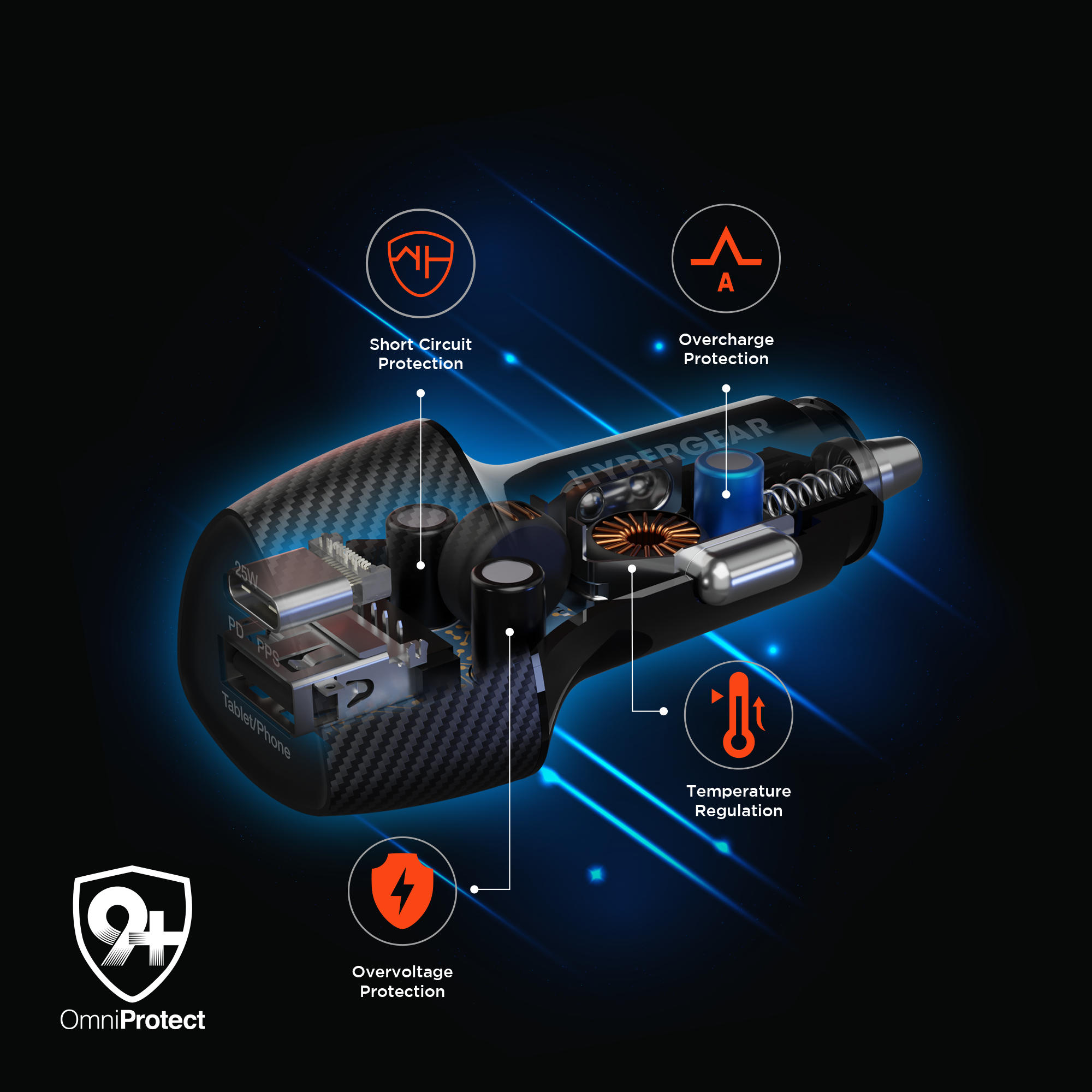 25W USB-C Power Delivery with PPS, plus an additional 12W USB output — the independent dual outputs don’t take power away from each other, so you get a guaranteed super-fast charge for your phone even while you simultaneously fast charge a tablet, accessory, or a passenger's phone with more than double the speed of your car’s built-in USB port.